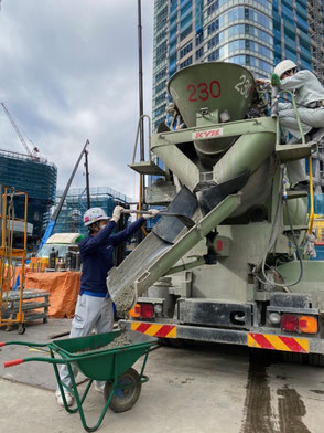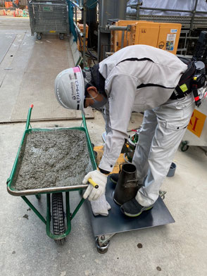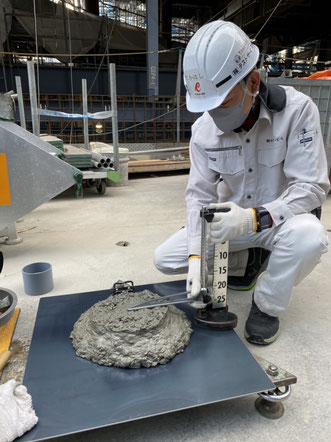 大手ゼネコンの建設現場に出向き、当日打設するレディーミクストコンクリートの品質検査、鉄筋継手部の超音波検査(非破壊検査)を行っております。